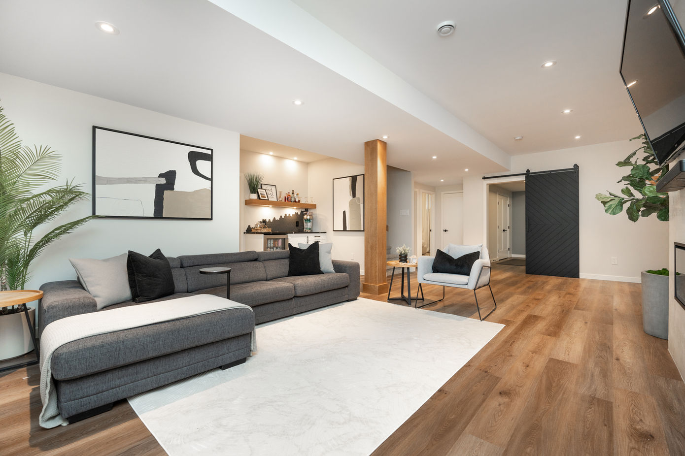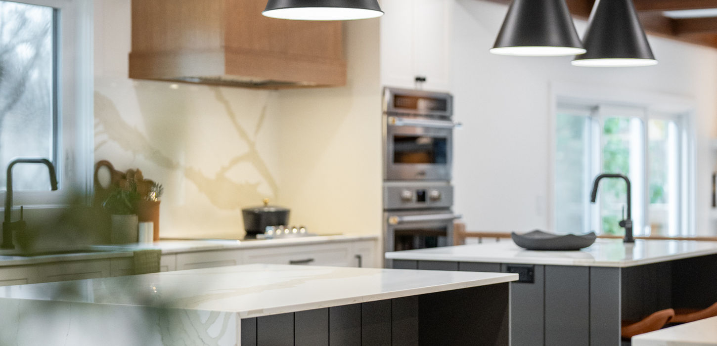 THIS MAIN FLOOR RENOVATION SHOWCASES TWO STRIKING FIREPLACES THAT DEFINE THE HOME’S WARM AND REFINED AESTHETIC. AT THE FRONT, A TEXTURED LIMESTONE FIREPLACE CREATES A COZY, INVITING LIVING SPACE, WHILE AT THE BACK, A MODERN LIME-PLASTERED FIREPLACE ANCHORS THE FAMILY ROOM WITH SUBTLE ELEGANCE. THE KITCHEN, FEATURING DUAL ISLANDS WITH A CHARCOAL BASE AND WATERFALL COUNTERTOPS, BLENDS FUNCTIONAL DESIGN WITH SOPHISTICATED STYLE. THROUGHOUT, WOOD BEAMS, LAYERED LIGHTING, AND NATURAL TEXTURES BRING TOGETHER A TIMELESS YET CONTEMPORARY FEEL.