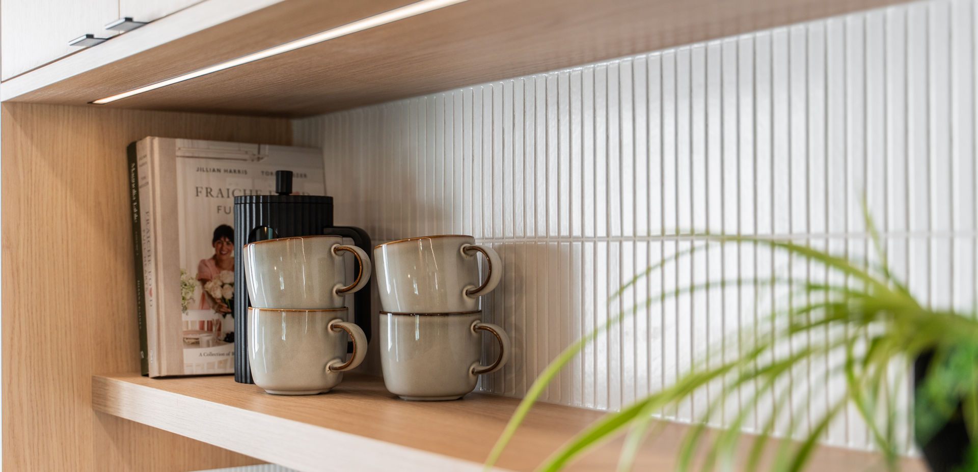 THIS MODERN KITCHEN SHOWCASES A SEAMLESS BLEND OF FUNCTIONALITY AND STYLE WITH ITS SLEEK, LIGHT WOOD CABINETRY AND SUBTLE DESIGN ELEMENTS. THE CLEAN LINES AND UNCLUTTERED SURFACES ENHANCE THE OPEN FEEL, WHILE WHITE TILE BACKSPLASH AND COUNTERTOPS BRIGHTEN THE SPACE. OPEN SHELVING ALLOWS FOR DISPLAYING DECORATIVE ITEMS AND EASY ACCESS TO EVERYDAY ESSENTIALS, CREATING A PRACTICAL YET AESTHETICALLY PLEASING ENVIRONMENT. NATURAL LIGHT FROM THE WINDOW ADDS WARMTH, MAKING THE KITCHEN INVITING AND IDEAL FOR BOTH COOKING AND SOCIAL GATHERINGS.